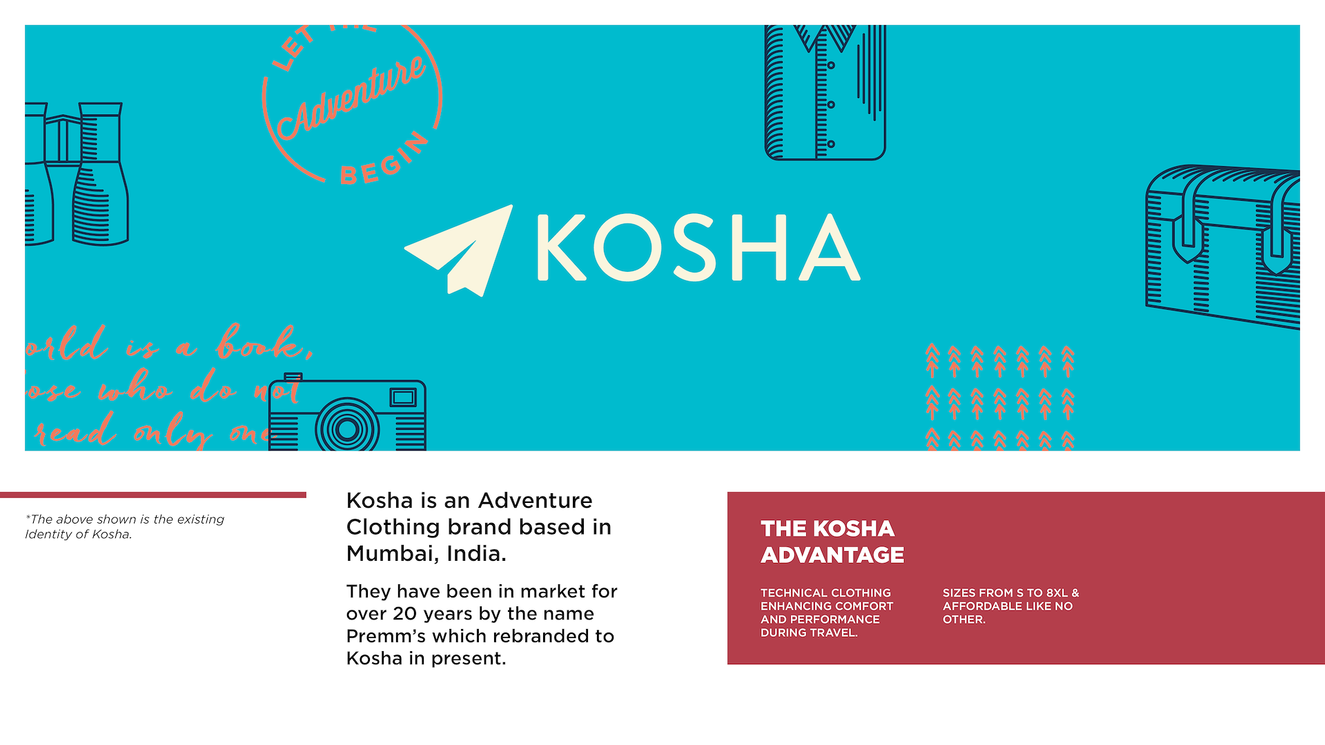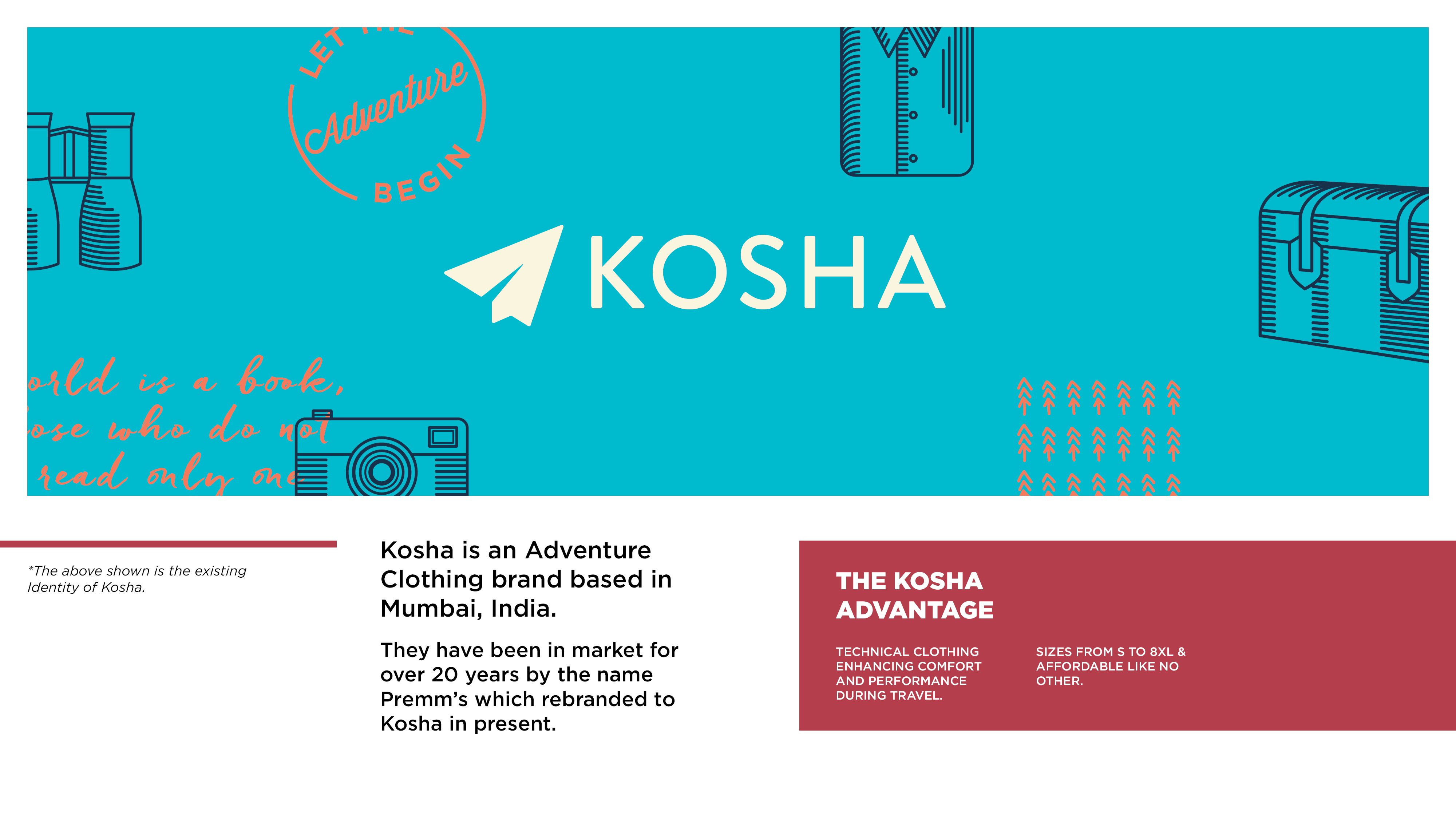 Kosha is an adventure clothing brand based out of Mumbai. They have been in market for over 20 years by the name Premm’s which rebranded to Kosha in present. The challenge was to reconceptualise the visual identity with an approach of raw experience while wearing their product range that helps you in adventures.
